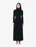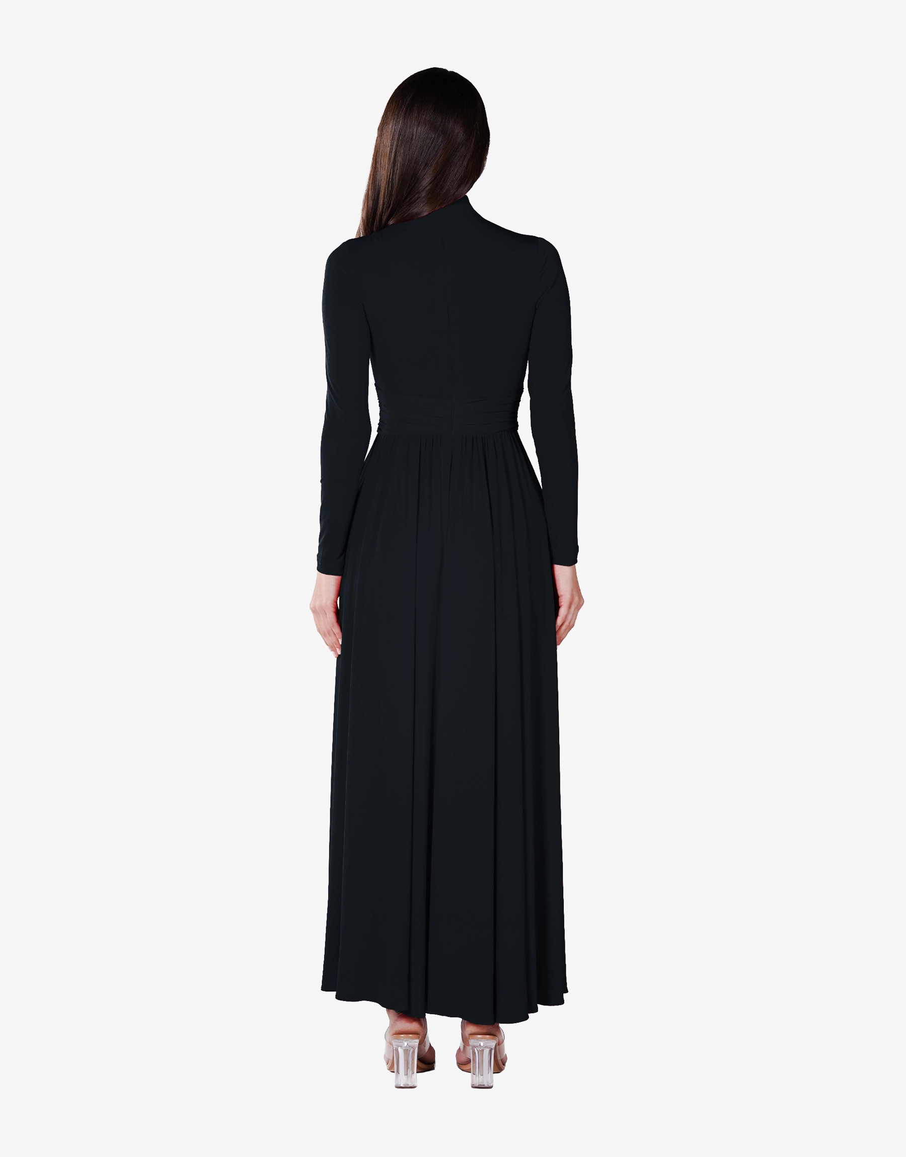 The waist is subtly cinched, anchoring the form, while the skirt falls into elongated pleats that move gracefully with every step.