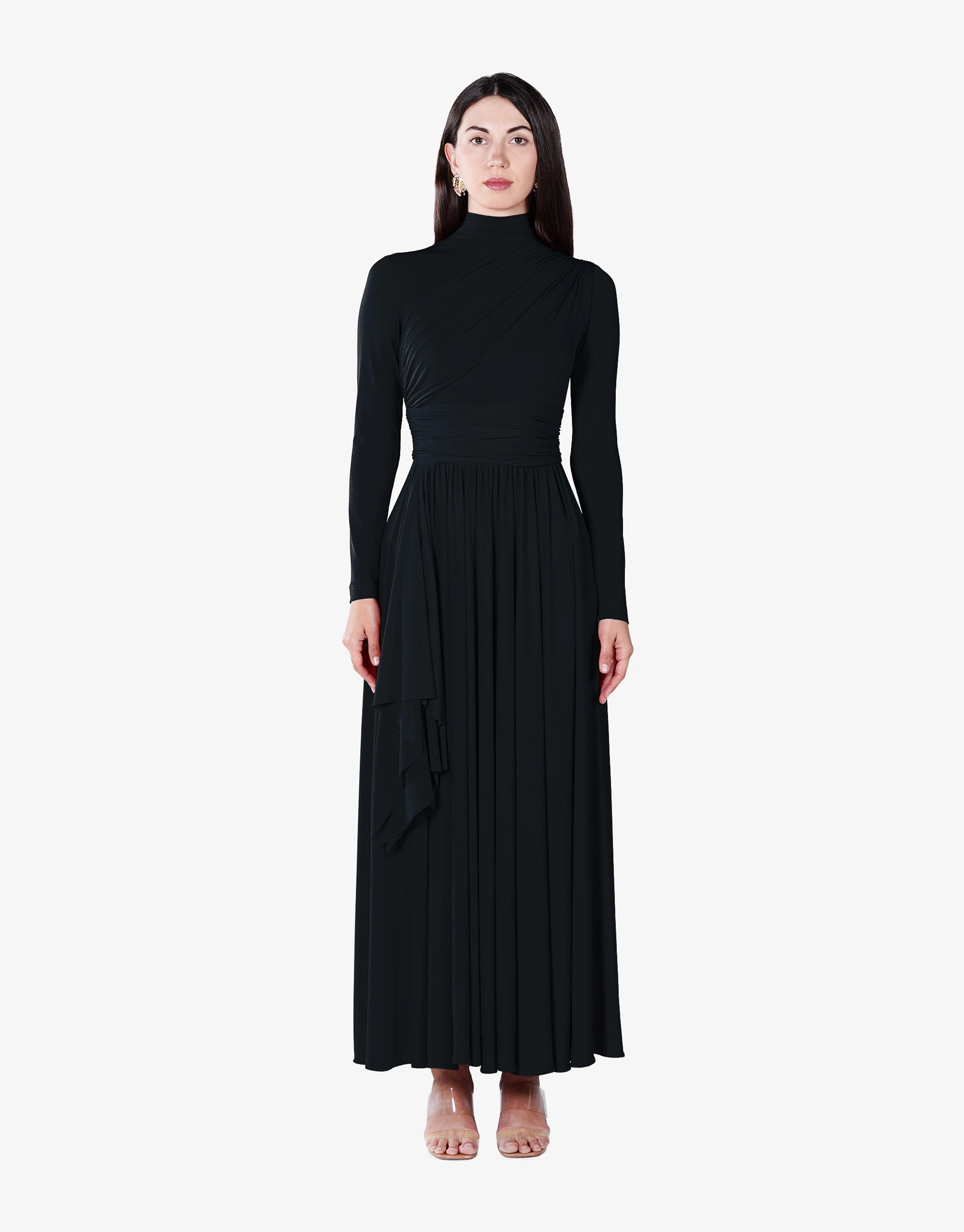 A cascading panel adds rhythm and depth, giving the dress a sense of motion even at rest.