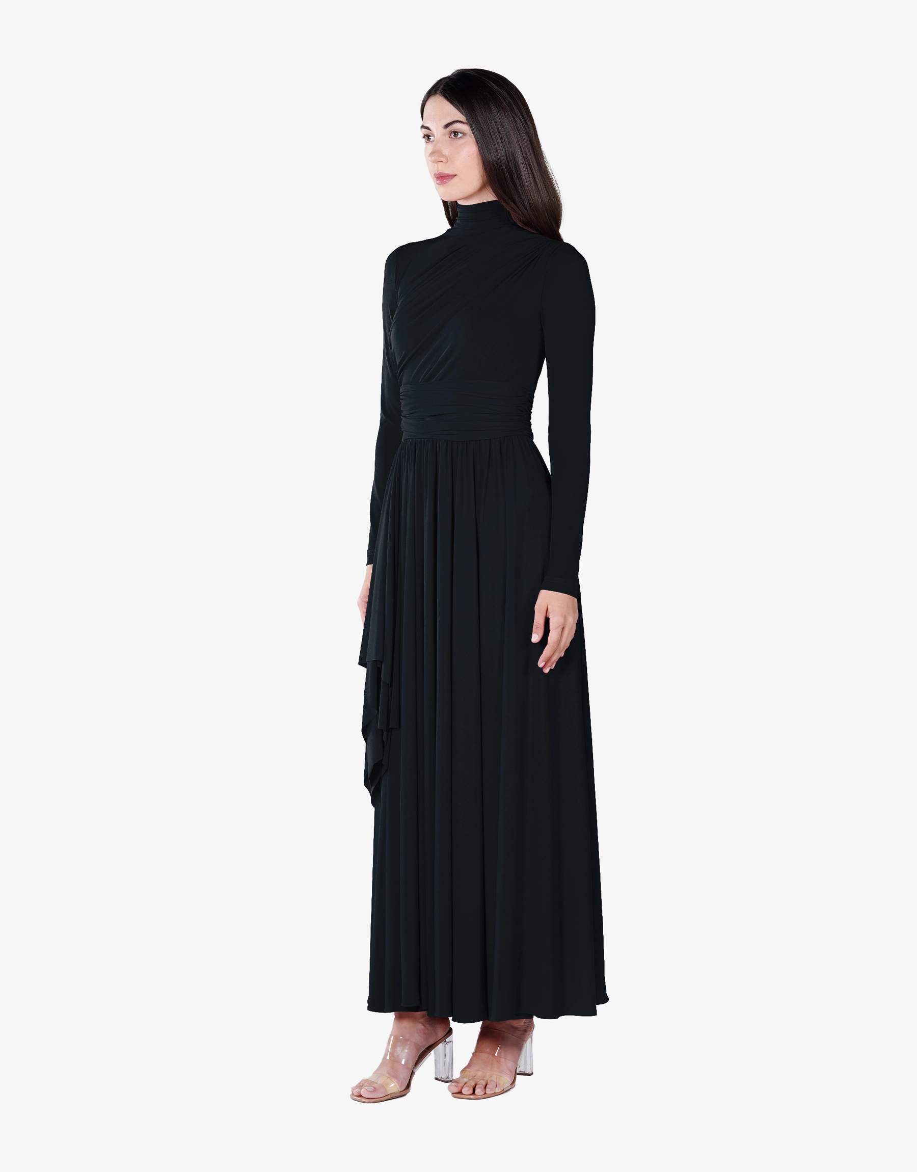Coeur Stable has a bodice that is delicately draped, creating soft diagonal lines that converge at the waist, subtly sculpting the silhouette without restriction. The cinched waist acts as an anchor, while the skirt falls into fluid, elongated pleats that move gracefully with every step. A cascading draped panel adds dimension and rhythm, giving the dress a sense of motion even at rest.