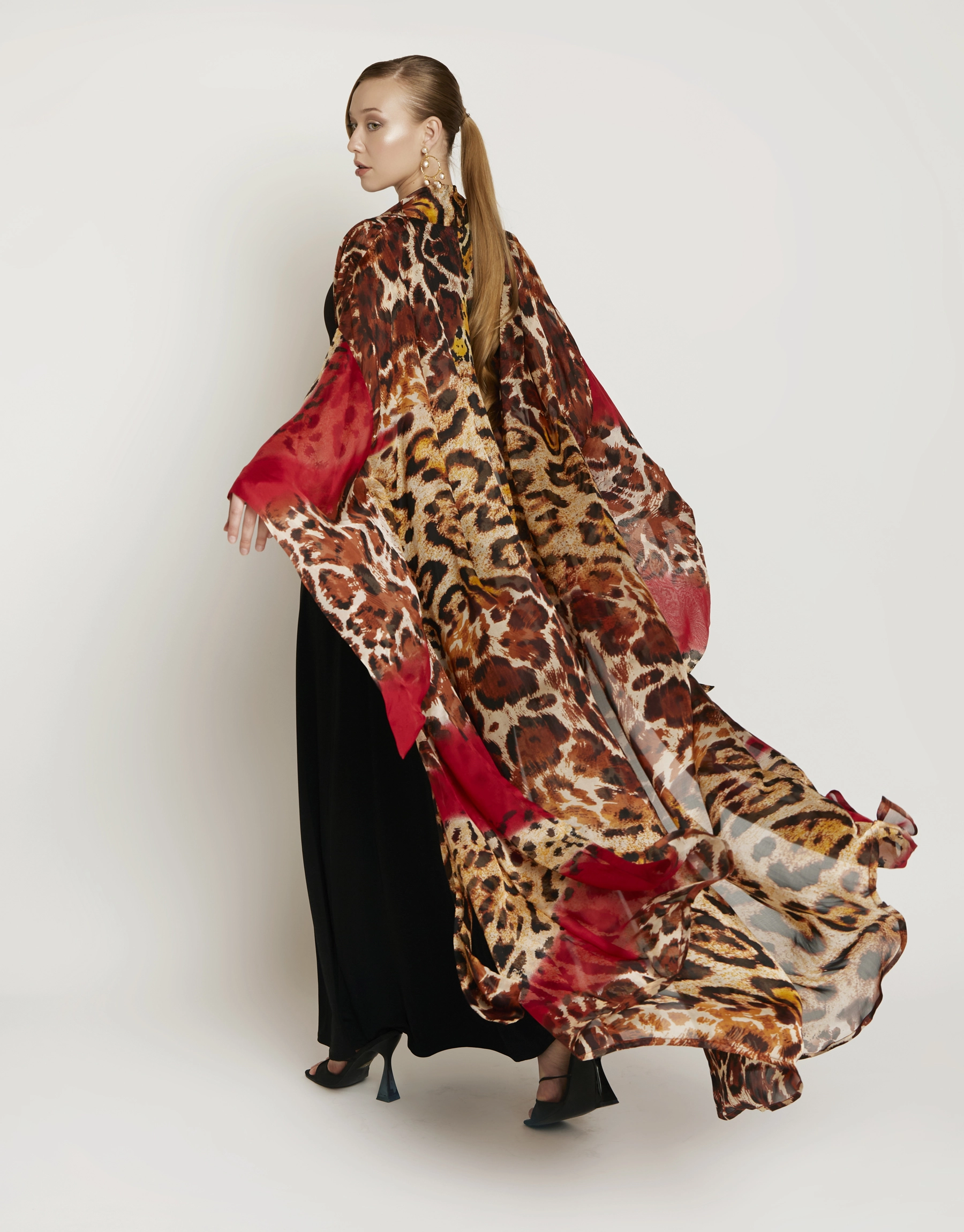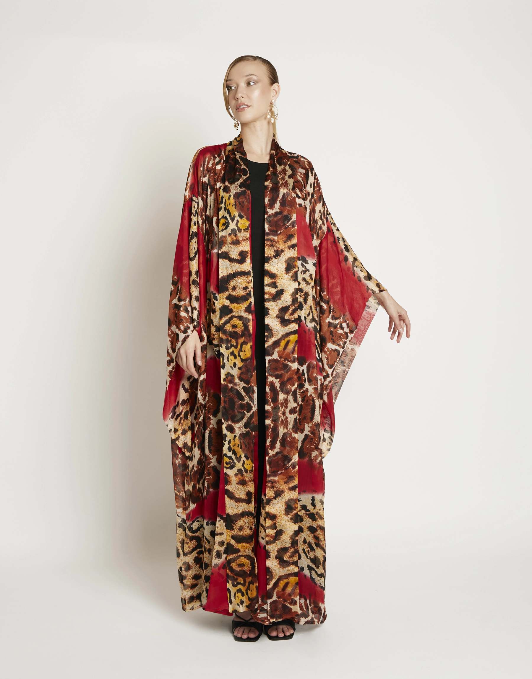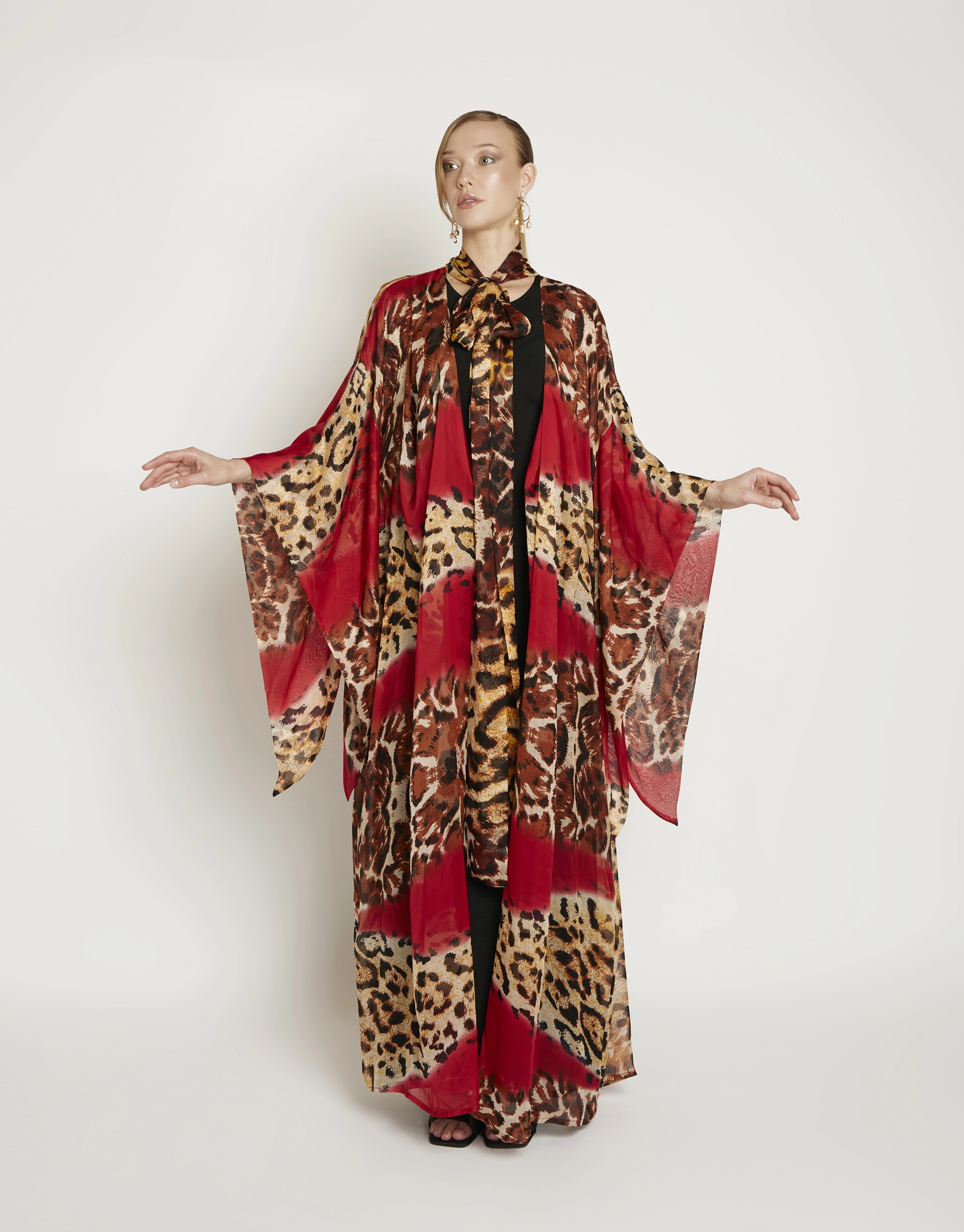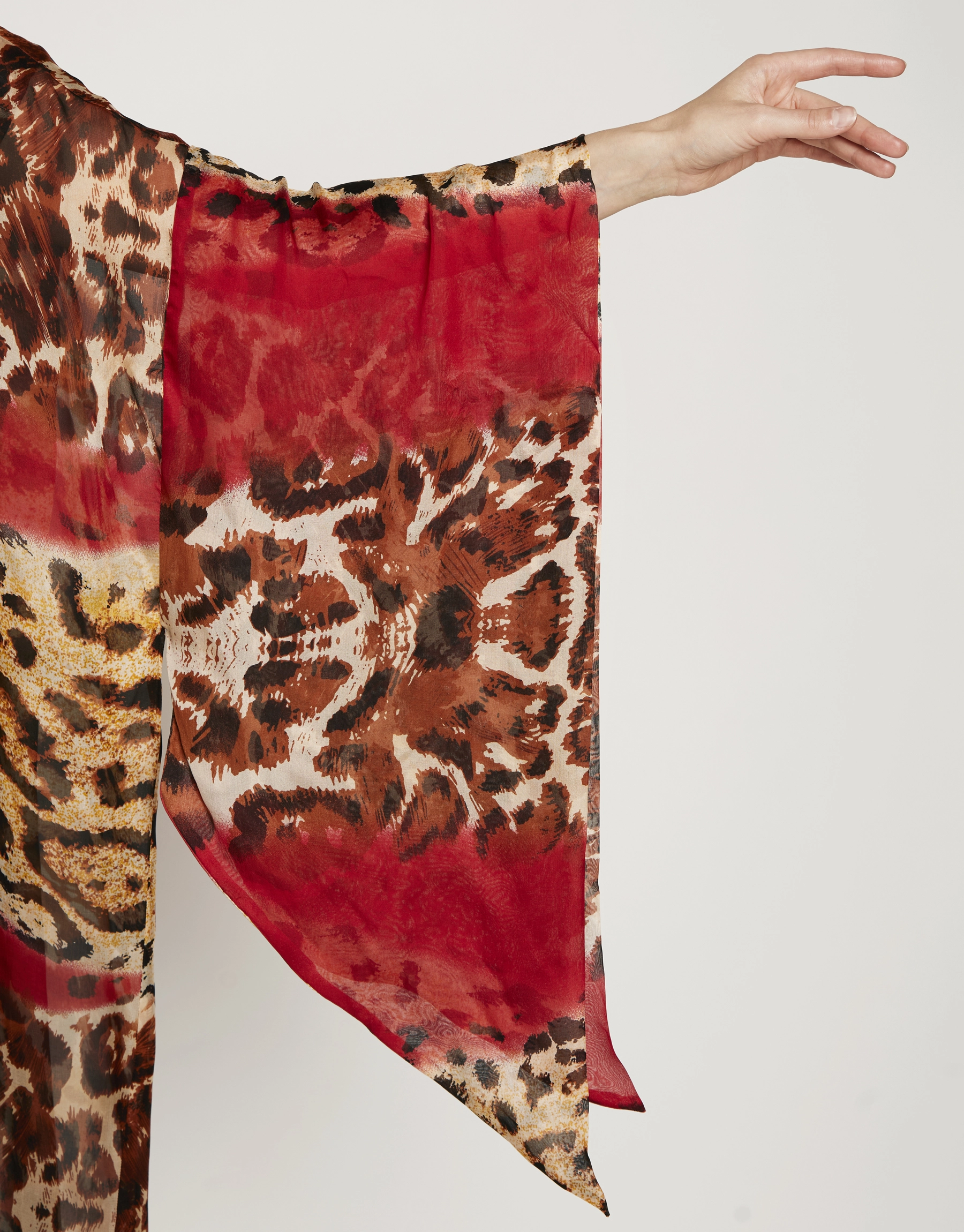 Le Fauve Rouge drapes the body in fluid movement ; where deep crimson melts into wild, organic patterns, creating a silhouette that feels both effortless and commanding. The airy fabric floats with every step, while the wide sleeves echo a sense of freedom and grace.